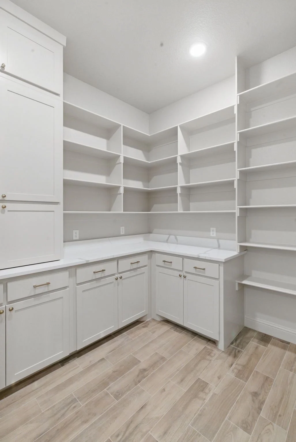 Adjacent to the kitchen is a large walk-in pantry that provides abundant storage and an ideal setup for everything from bulk grocery organization to small appliance access. Custom open shelving keeps the space functional and stylish, while wrap-around countertops maximize prep and display potential.