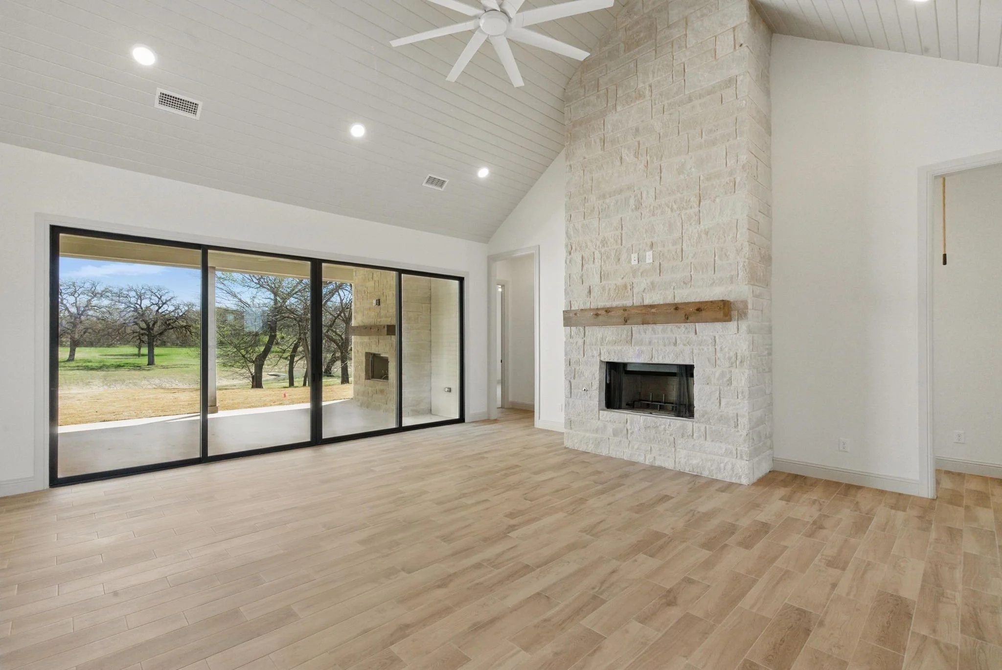 The living room centers around a beautiful stone fireplace with a wood beam mantle and soaring vaulted ceilings above. The tongue-and-groove ceiling detail adds architectural character and connects the indoor space to the home’s natural surroundings. Large sliding doors bring in natural light and offer direct access to the covered back patio, which includes another fireplace and a peaceful view of the property beyond.