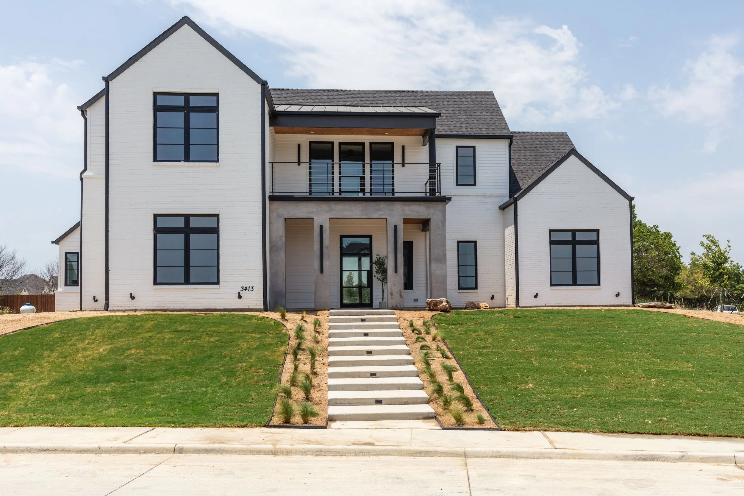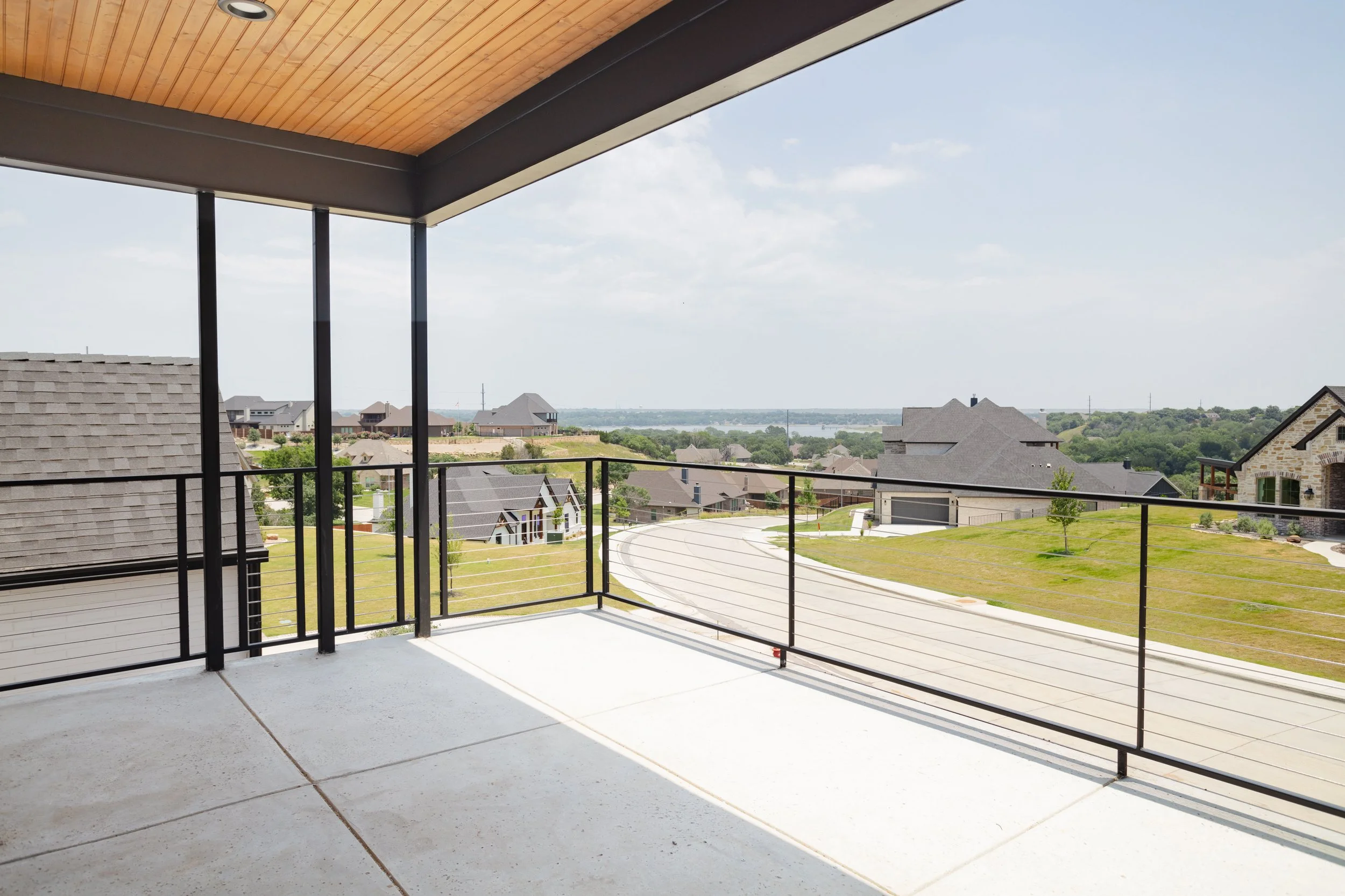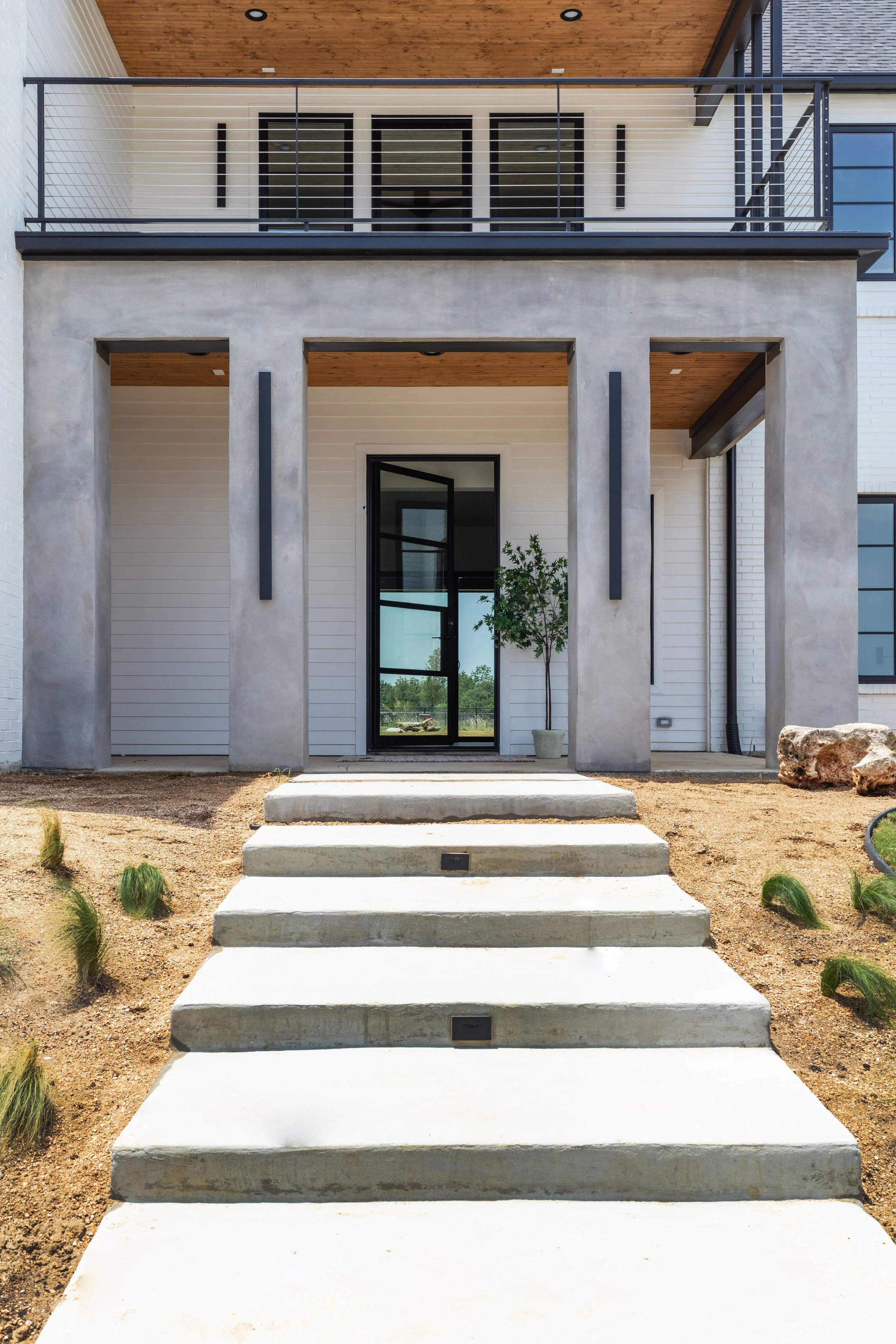 Lakeside Dream is a beautiful two-story modern house with a clean white exterior and black windows. The second-story balcony has a stylish wooden ceiling accent and a sleek black railing with stainless steel cables, giving it a contemporary look. The grey concrete entryway adds a nice touch to the overall design. It's definitely a place that stands out!