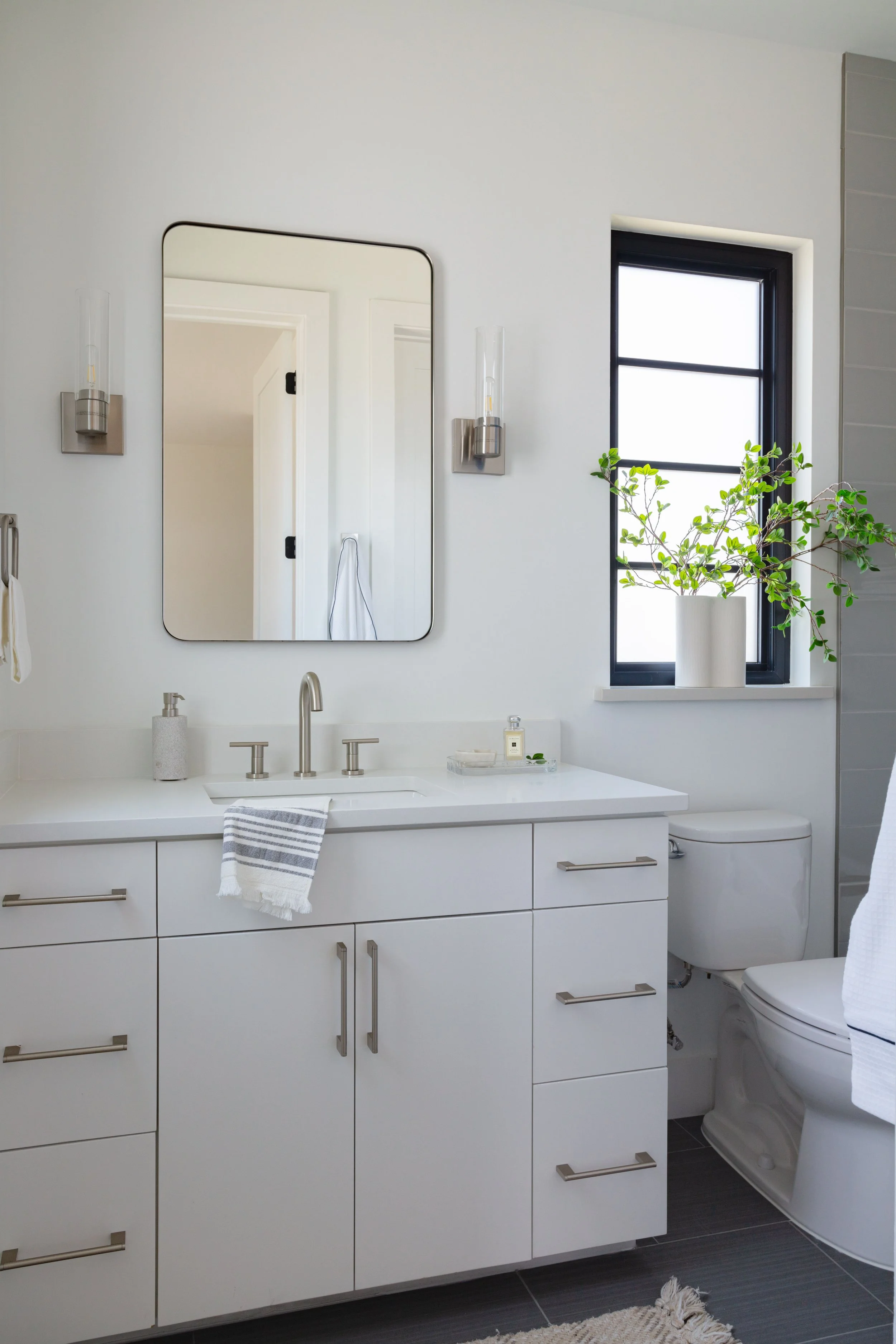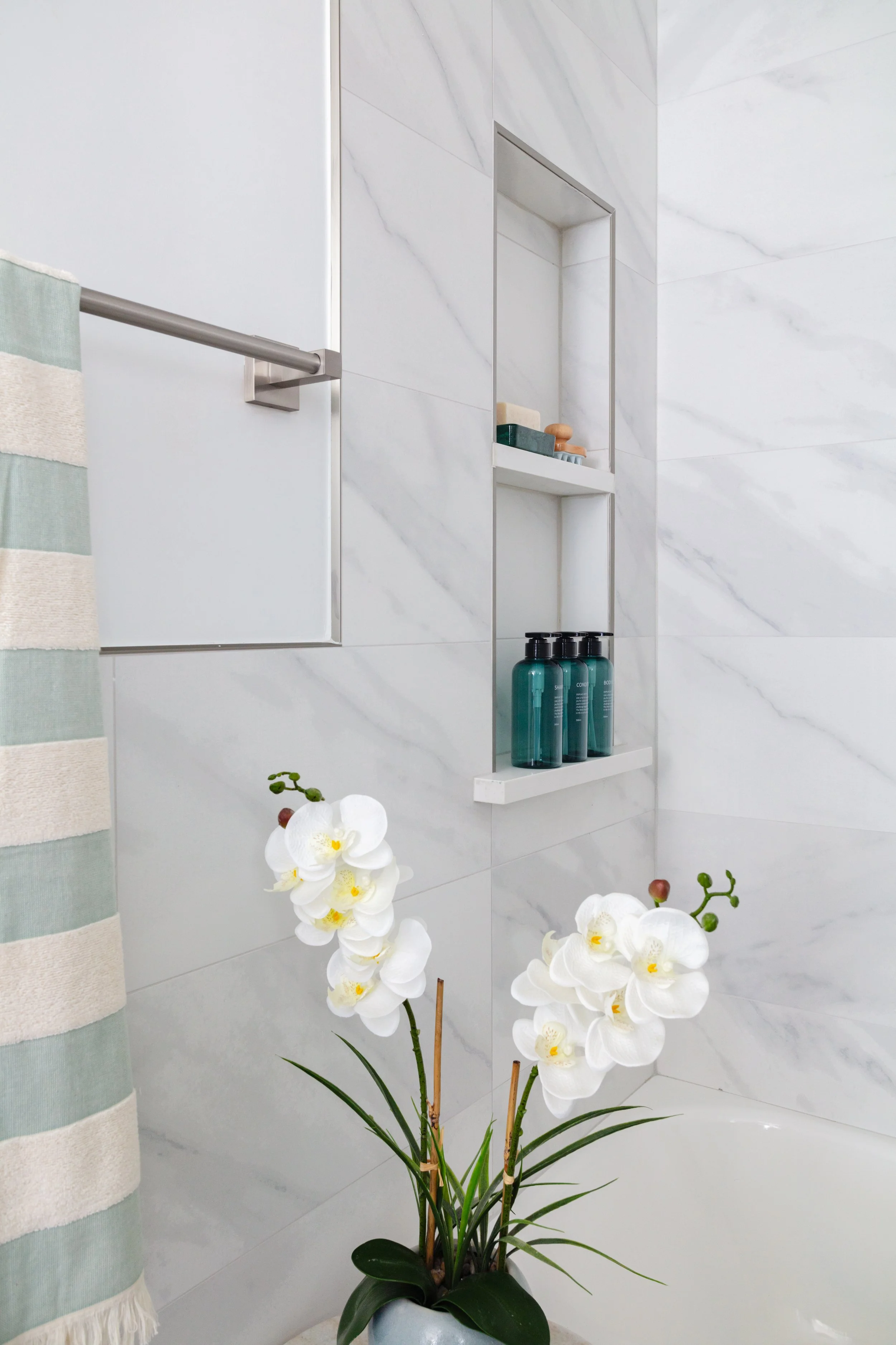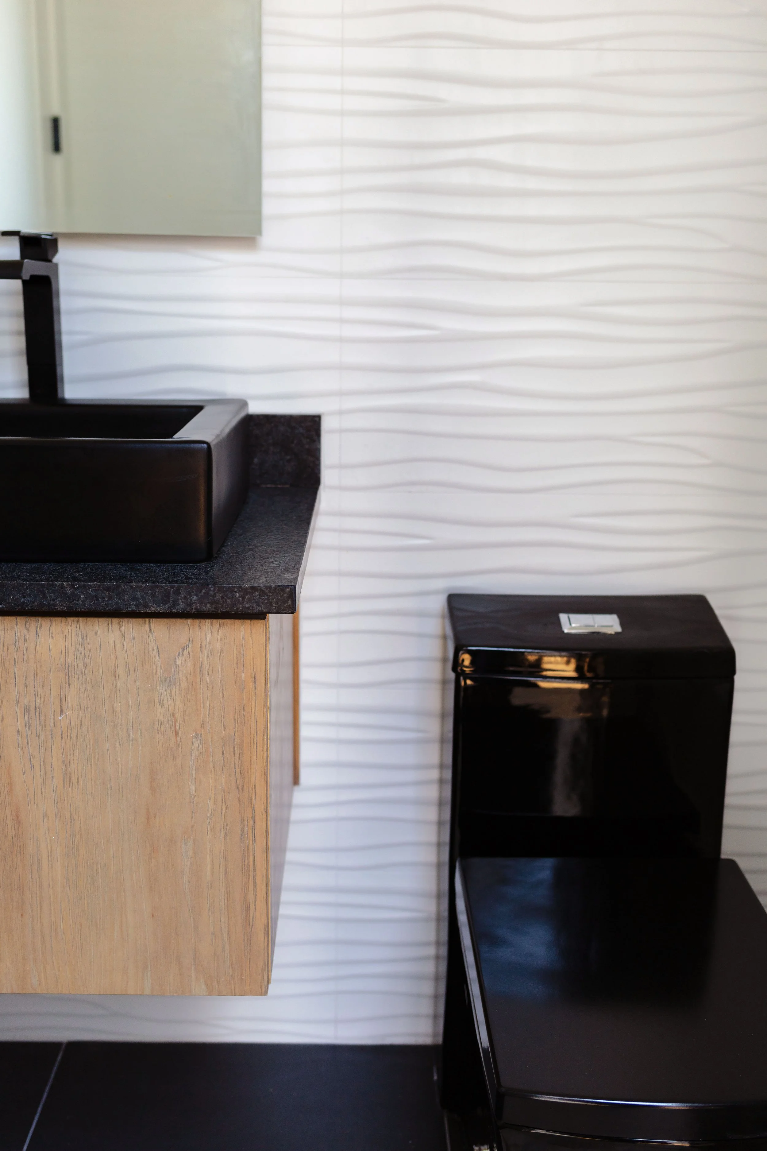 The master bathroom features a modern design with a freestanding tub and couples shower, creating a clean and refreshing look. The shower boasts a modern design with two black shower heads and a matching hand-held wand on each side, offering versatile showering options. The white tiled walls create a clean and bright contrast against the black fixtures. Wooden cabinets add warmth and a touch of natural elegance to the space. The combination of these elements creates a stylish and inviting bathroom environment, perfect for a retreat and self-care.