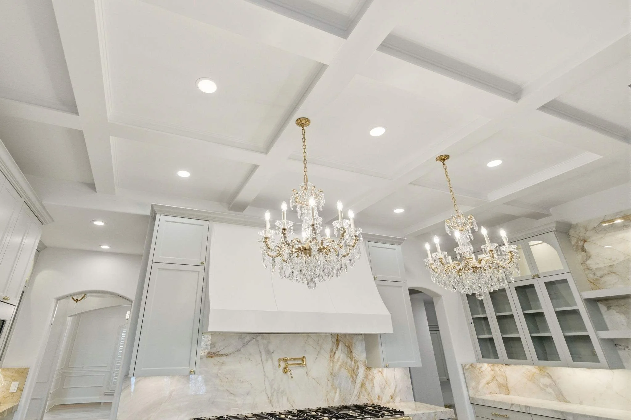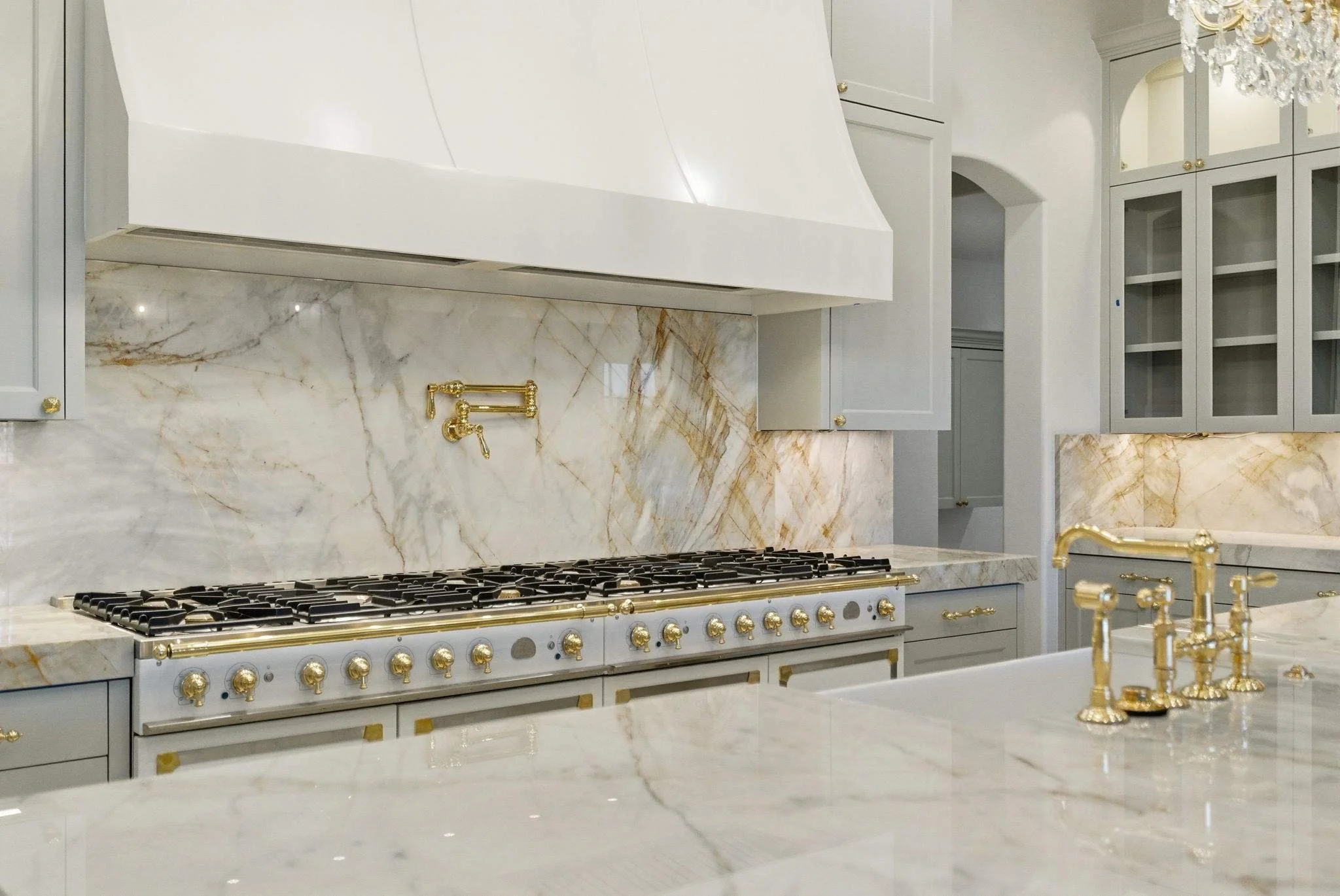 This kitchen showcases a grand, luxury design with expansive marble countertops and a striking full-height marble backsplash featuring warm gold veining. Soft gray cabinetry with brass hardware complements the polished surfaces, while a massive island with a farmhouse sink anchors the space. Crystal chandeliers and a coffered ceiling add dramatic elegance, and a professional-grade range with gold accents completes the sophisticated, high-end chef’s kitchen aesthetic.